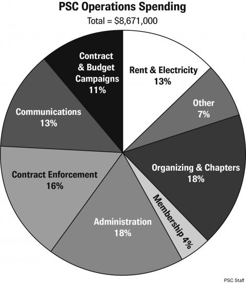 The remaining 42 percent of PSC spending went to rent – including the PSC Union Hall – and physical operations, like utilities, computer and copying equipment and maintenance, as well as insurance, accounting, office supplies, chapter elections, and administrative operations to keep the union office and its support for chapters working effectively. Managing membership records and databases is a critical part of the union’s work and accounts for 4 percent of spending.