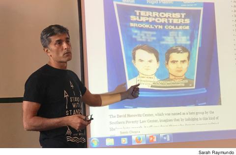 Chopra’s illustrated “mugshot” on a Horowitz Center poster isn’t stopping him from speaking his mind. “If you did back down, you would be doing what they would want you to do,” Chopra, a professor in the department of philosophy, told Clarion. “That feels like cooperating with them, which I don’t feel like doing.” Chopra admitted he is in a somewhat privileged position. He’s tenured, and he’s not looking to change jobs. But the posters and the concerted campaign against him and others who focus on Palestine, has its cost. In Chopra’s view, his days on the job market are “over.”