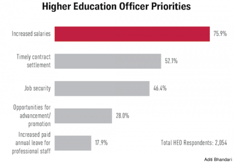 - Nearly half of adjunct faculty and HEO respondents included job security in their top three priorities.