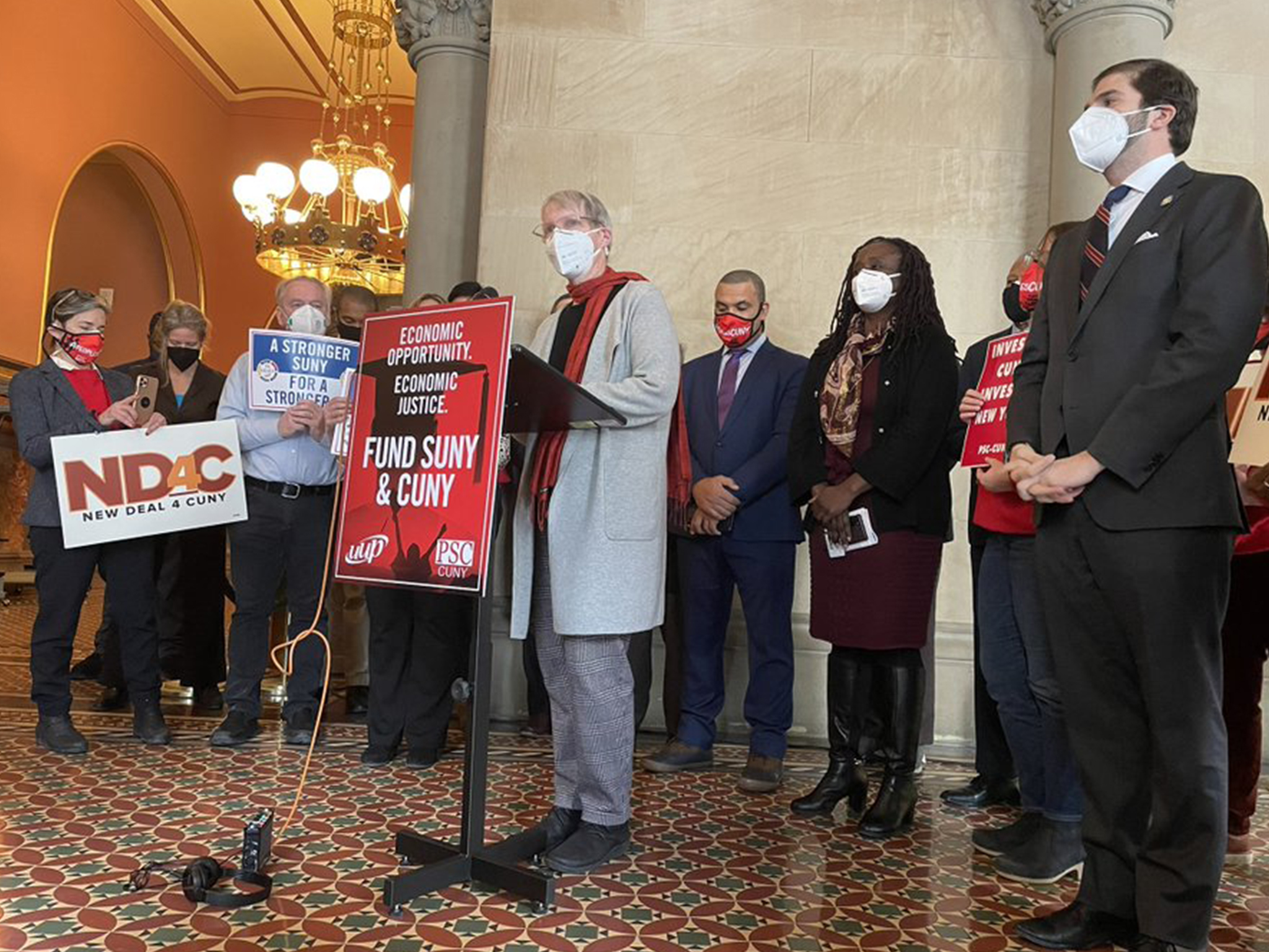 ALBANY, NY – February 7, 2022 – The Professional Staff Congress/CUNY (PSC), the union representing 30,000 faculty and professional staff at the City University of New York, and United University Professions (UUP), the nation’s largest higher education union, held a joint press conference calling on state leaders to increase funding to SUNY and CUNY programs after more than a decade of chronic underfunding.
